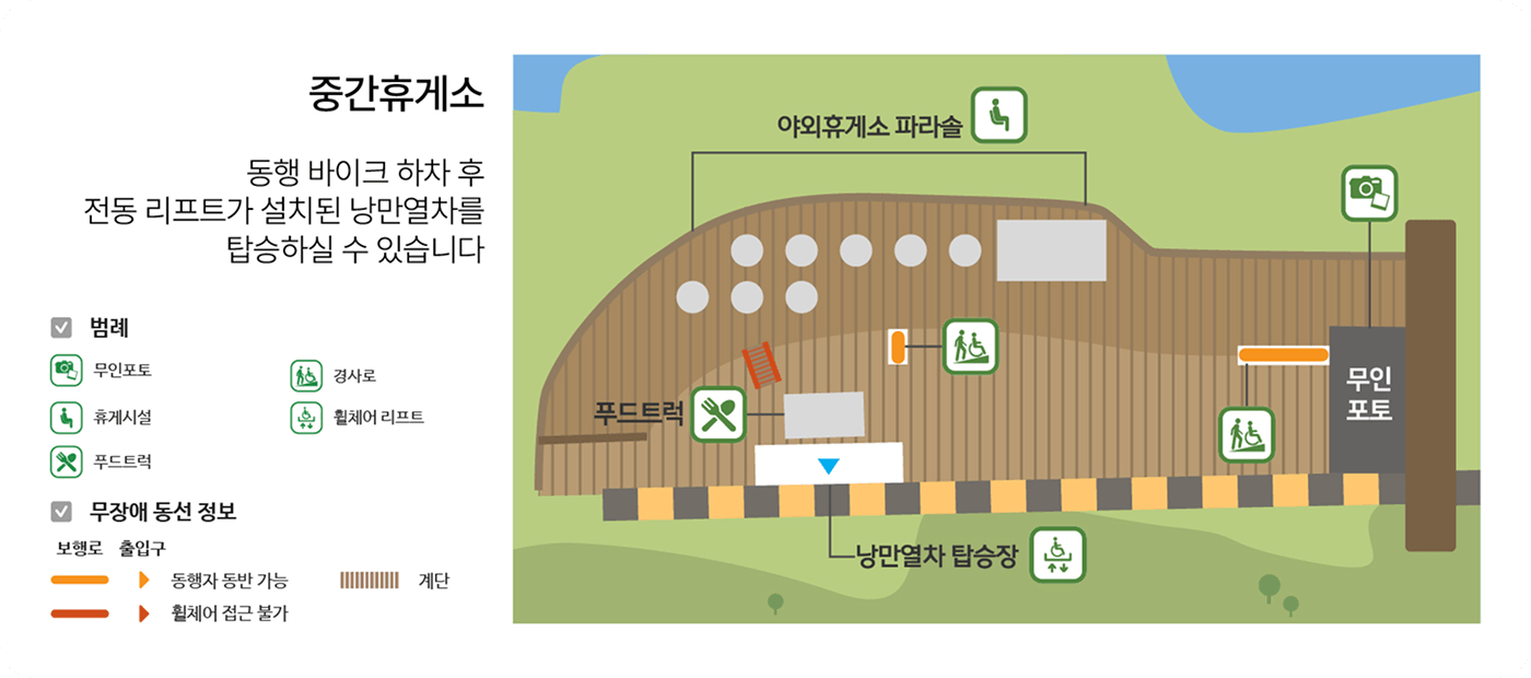 동행 바이크 하차 후 전동 리프트가 설치된 낭만열차를 탑승하실 수 있습니다.